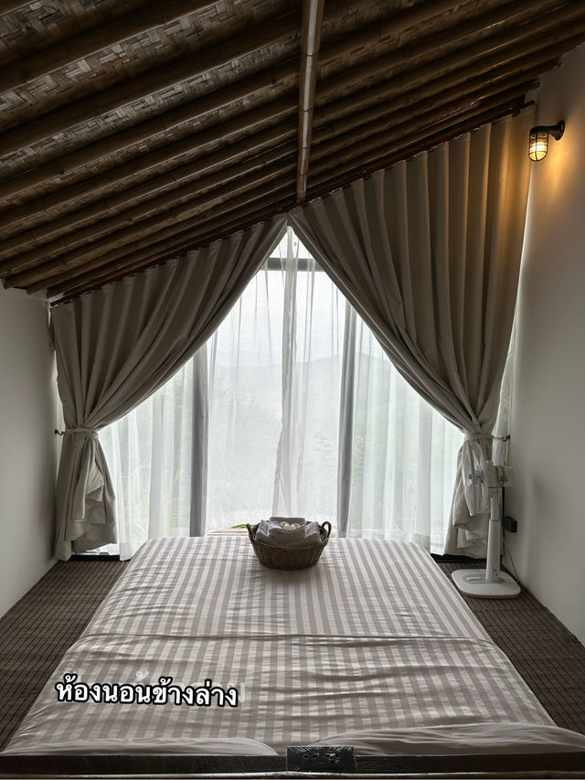 If you want to sleep with a mountain view or a natural mist, Mon Ngo is the place for you. The view is amazing, it's so beautiful, and the atmosphere is amazing. The price is reasonable, and the grilled pork is delicious! It takes 1 hour and 50 minutes from Chiang Mai Airport. The road up here is a bit scary, with lots of curves. Traveling at night is not recommended, as it can be very dangerous. Our room was called Kasalong. It accommodates 4 people and has 2 rooms. There's one upstairs and one downstairs. The upstairs room is larger than the downstairs room. But it's still comfortable. At night, we barely used the fan because it was so cold. Bring warm clothes and socks. We went during the rainy season, but unfortunately, we didn't see any mist. If you're lucky, you'll see mist here. The sea of ​​mist is absolutely stunning. (I saw it in many friends' reviews, so we came here. 😁) Price: 5,000 baht (breakfast included) 📍Juliea Camp Mon Ngo (Mon Ngo Mountain Peak) #tripbestfreeaccommodation #ChiangMaiMountainAccommodation #ChiangMaiTravel #MonNgoDoiAccommodation