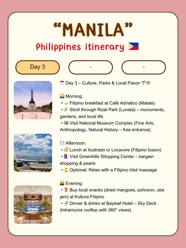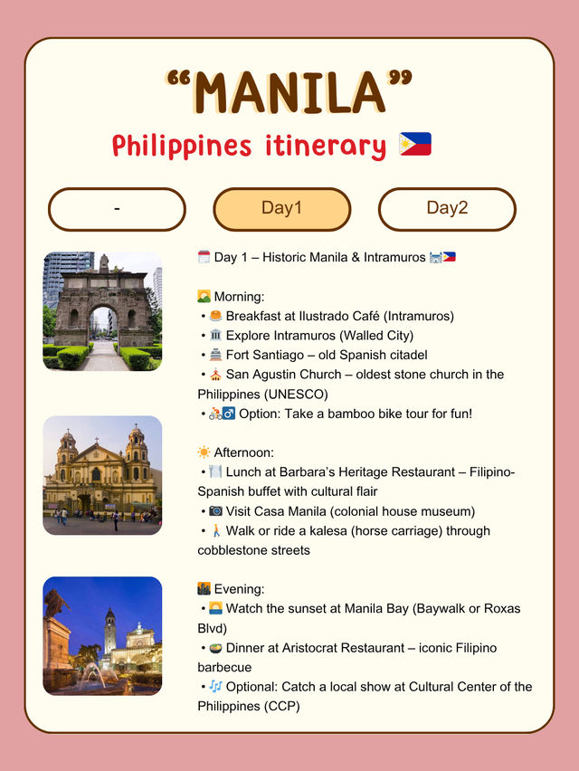 #manilaguide 🏰 Discover Intramuros – Manila’s Historic Heart 🇵🇭 📍Location: Intramuros, Manila, Philippines 🕰️ Opening Hours: 8:00 AM – 6:00 PM daily 💸 Ticket Price: Free to roam; Fort Santiago and museums have small entry fees ✨ Highlights: Step into Intramuros, Manila’s iconic walled city, and travel back to the Spanish colonial era! 🏛️ Wander along cobblestone streets, admire ancient churches ⛪, and explore historic forts and plazas 🌳. Must-see spots include Fort Santiago, San Agustin Church, and Casa Manila, each offering a glimpse into the Philippines’ rich history 📜. Don’t forget to ride a traditional kalesa 🐴 for a truly immersive experience! Enjoy the peaceful gardens, snap perfect photographs 📸, and soak in the old-world atmosphere that makes Intramuros a cultural gem of Manila ❤️. 🚗 How to Reach: Easily accessible via taxi, Grab, or jeepney. Nearest LRT station: Central Terminal 🚉 #Intramuros #HistoricManila #WalledCity #PhilippinesHeritage #TravelManila #OldTownVibes