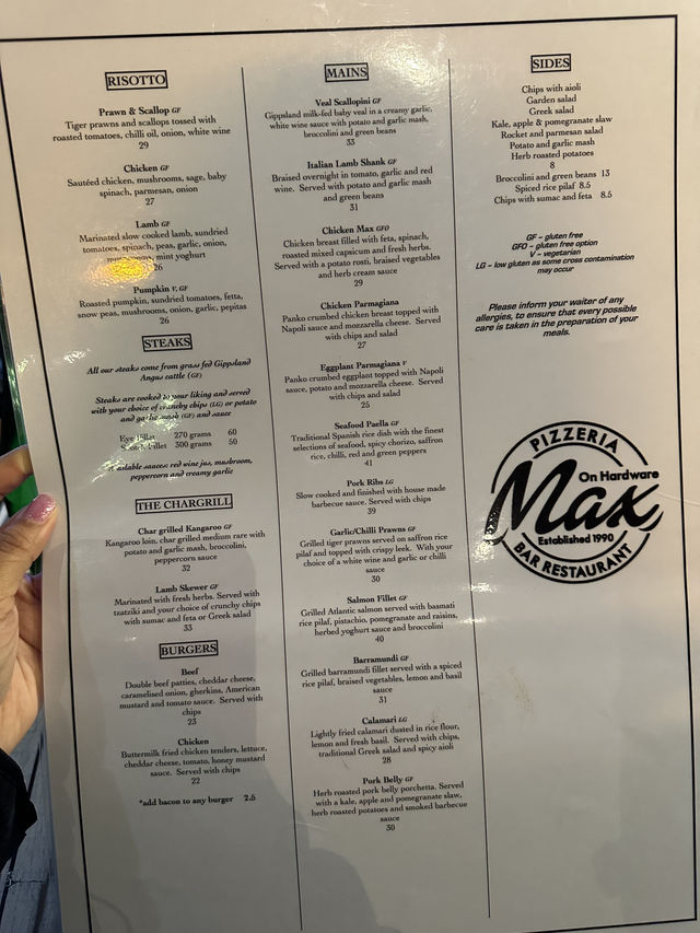 When in Australia, why not try kangaroo meat? Let's head to Max on Hardware Pizzeria Bar Restaurant! If you ever take a stroll down Hardware Lane in Melbourne, you'll immediately notice the charm of this street. It's lined with restaurants on both sides, with tables and chairs set up along the walkway, soft music playing in the background, giving off a very European vibe. One of the most eye-catching spots here is Max on Hardware. This restaurant offers both outdoor seating, where you can enjoy the breeze and the atmosphere, and indoor seating, which feels warm and cozy. But the menu item that truly caught my attention was the Char Grilled Kangaroo. Since I was in Australia, I thought it was the perfect opportunity to try something unique to this country. When the dish was served, the aroma of grilled meat was irresistible. The kangaroo meat was grilled to perfection—not overcooked—so it remained tender. The taste is somewhat similar to beef but has its own distinctive character. Personally, I found the smell to be milder than I expected. It was served with sides like roasted potatoes and fresh vegetables, which complemented the dish perfectly. This meal was truly a culinary adventure for me. Apart from kangaroo meat, the restaurant also offers a wide variety of pasta and pizza. Judging by what other tables were ordering, those dishes looked equally delicious. Overall, this restaurant is not just about great food but also offers a memorable experience with its excellent ambiance and intriguing menu. If you're curious about trying kangaroo meat, this is the place to go. Location: Address: 143/145 Hardware St, Melbourne VIC 3000, Australia