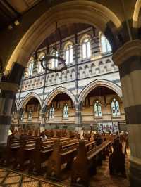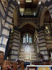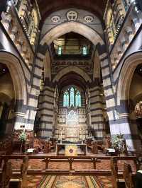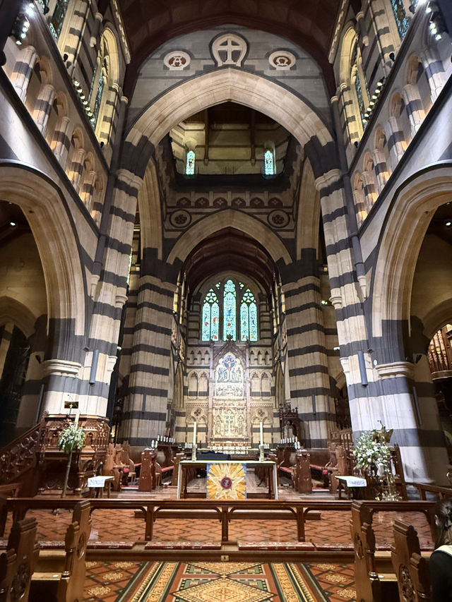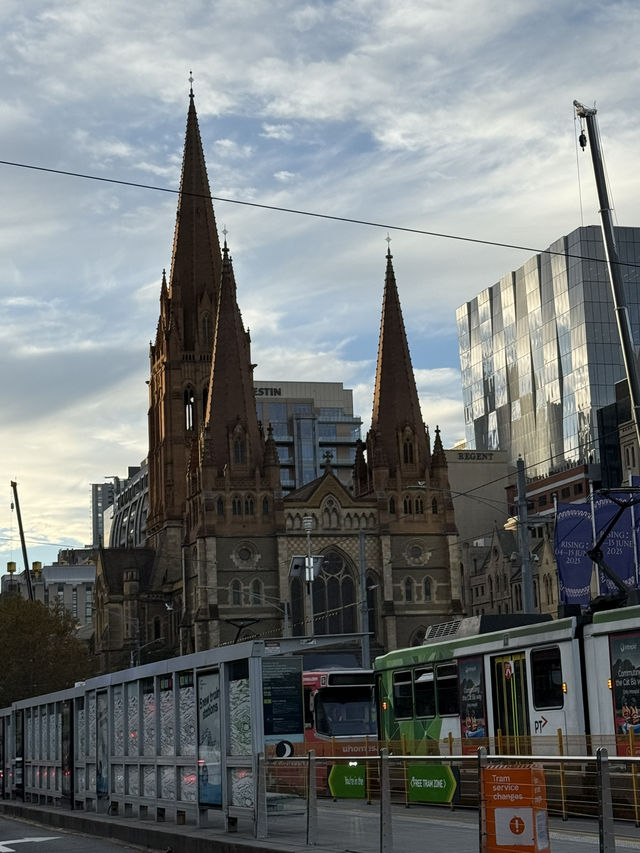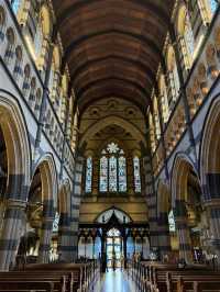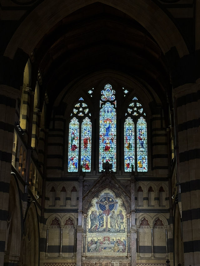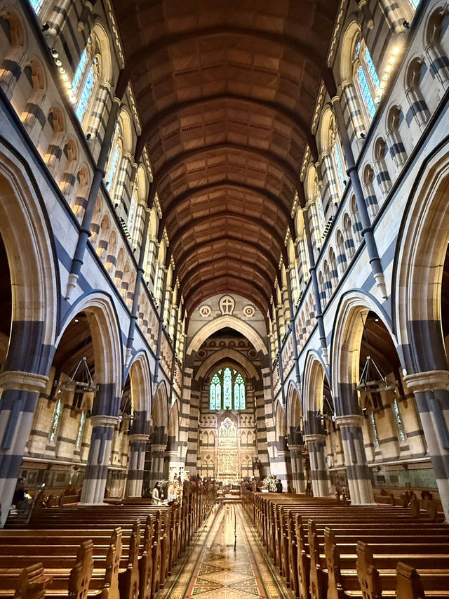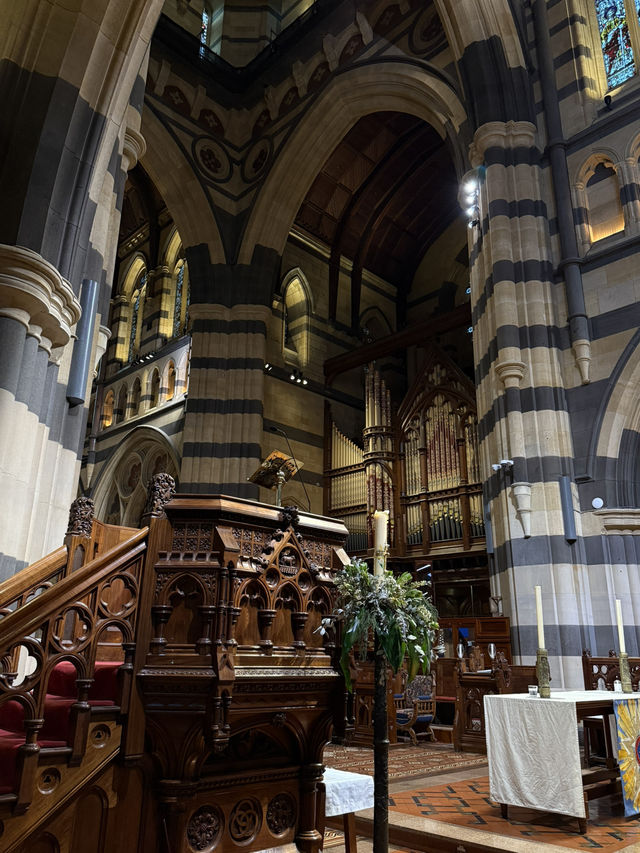 At St. Paul's Cathedral in Melbourne, every step is a dialogue with history and art. Gothic Revival: An Architectural Epic of Retro and Romanticism Gothic Revival architecture was a popular architectural style from the late 18th to the 19th century. Drawing on medieval Gothic architecture, it blends retro nostalgia with romanticism, becoming a recognizable style in architectural history. Standing opposite Flinders Street Station, your eye is immediately drawn to the bluestone exterior of this neo-Gothic building. Entering the cathedral, black and white stone columns, like the backbone of time, support the soaring dome. Sunlight filters through the stained glass windows, casting a dazzling light on the glazed floor tiles. Each stained glass window tells a biblical story, and every wood carving reflects the craftsman's devotion. The organ here is one of Australia's oldest instruments. On Sunday afternoons, the choir's singing echoes beneath the dome, transporting you back to medieval Europe. A closer look reveals subtle zodiac signs hidden within the wooden carvings of the choir stalls, offering a wealth of surprises. Not only is it Melbourne's oldest English-style church, it also bears witness to the city's history. The statue of Matthew Flinders outside the church silently guards the city's pioneering memories. Here, the bustling city seems muted, leaving only the architectural beauty and the legacy of history lingering in the air, inspiring awe and tranquility. #MelbourneAttractions #OceaniaTravel #GothicRevivalArchitecture