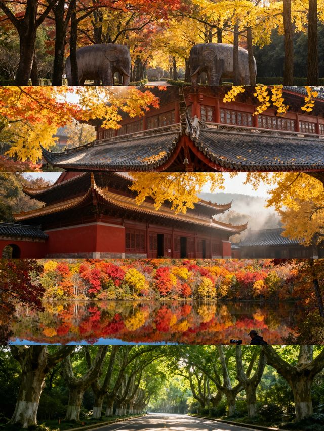 Autumn in Nanjing is not just a change of seasons, but an experience that transcends time. Feel the echoes of history under the phoenix trees, gaze at the traces of time in front of ancient temples, and capture the dance of light and shadow by the lakeside—this may be the true charm of "Nanjing turning into Jinling." If you have already planned your trip, remember to bring enough memory cards and a calm, unhurried heart, because every frame here is worth savoring. Late October to mid-November is the golden period to enjoy Nanjing’s autumn scenery. Make your plans and go meet the autumn colors of Jinling in your heart! 🏯 Pilu Temple and Chaotian Palace - A visual feast blending ancient and modern · Pilu Temple: Autumn leaves complement the ancient temple, enhancing the Zen atmosphere in the golden season. · Chaotian Palace: A century-old building transformed into a fashion show venue. At the recent Nanjing International Fashion Week, it combined avant-garde fashion aesthetics with light and shadow technology, achieving a deep dialogue between historical context and modern trends. 🌳 Yanque Lake and Linggu Temple - A symphony of autumn colors · Yanque Lake: The lake reflecting the colorful autumn forest has become a paradise for photographers. · Linggu Temple: The combination of the ancient temple and ginkgo trees creates the most classic autumn scenery in Nanjing. Phoenix Tree Avenue: Century-old phoenix tree branches intertwine, weaving an endless green tunnel in the sky. Sunlight filters through dense leaves, casting dancing light spots on the asphalt road, like a natural piano playing with light and shadow. · Music Stage: Hundreds and thousands of white doves sometimes skim over the ancient Greek-style colonnade, sometimes precisely land on visitors’ palms. When the flock flies together, the sound of flapping wings rises like a tide, drawing beautiful white spirals above the curved stands. · Ming Xiaoling Stone Elephant Road: Known as "the most beautiful 600 meters," the autumn colors have already begun to appear. Footage from October 22 shows beech trees changing color, ginkgo trees turning yellow, and the colorful autumn of Jinling slowly unfolding.