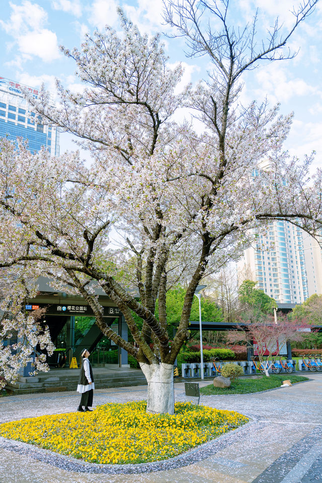 Last night's strong wind broke a branch of the Somei Yoshino cherry trees at the entrance of the Cherry Blossom Park The hanging branch created a special 📷 photo spot You can take pictures with the cherry blossoms 🌸 directly in your face No need to stand on Ladder Mountain 🪜 to take photos with the cherry blossoms anymore When I went there in the early morning, I was amazed by the cherry blossom petals all over the ground Standing under the tree, as the wind blew, the petals fell, it was really like the '5 Centimeters Per Second' A real-life Japanese anime scene, so beautiful‼️ This cherry tree is located at Exit B of the Cherry Blossom Park subway station It's a Somei Yoshino cherry tree with a large canopy and white flowers It has already grown a lot of leaves🍃 and can be viewed for another day or two Inside the Cherry Blossom Park, near the children's playground, there is another large one in full bloom The other cherry blossoms are more scattered Some buds on the overpass have bloomed this morning It is estimated that they will all bloom in the next few days Wearing a horse-face skirt and Hanfu to take pictures here 📷 will be very beautiful 📷Photo taken at 7:00 am on March 24 🚇Cherry Blossom Park Subway Line 1️⃣ Line 3️⃣ Exit B 🚗Cars can be parked at the entrance of the Sixth Space community