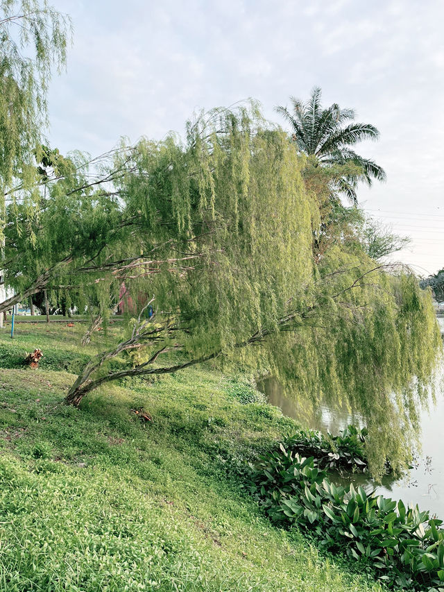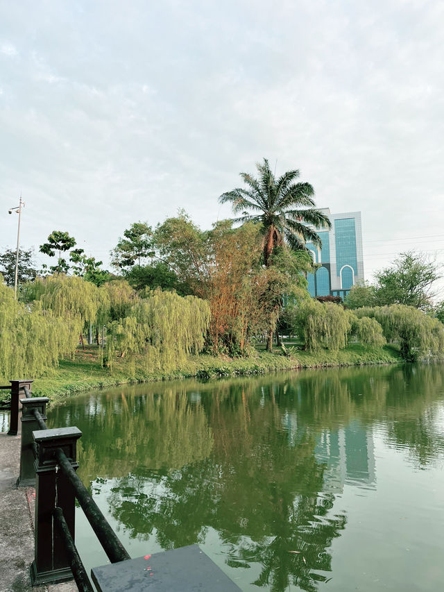 #springwander Taman Jaya Park in Petaling Jaya is a serene lakeside park popular for jogging, walking, and enjoying lush greenery. It features a jogging track around the lake, stone benches, grassy picnic areas, and mini fountains. Visitors can also enjoy activities like cycling, roller skating, and fishing (with a permit). The park is adjacent to Amcorp Mall and the Petaling Jaya Museum, offering a peaceful retreat from urban life with its lush greenery and serenity by the lake.