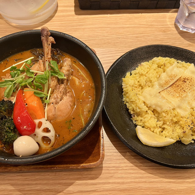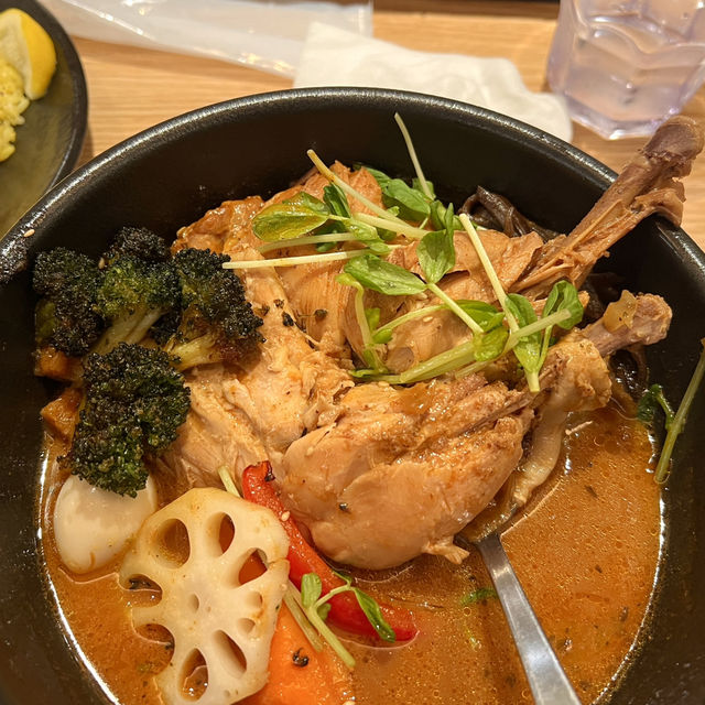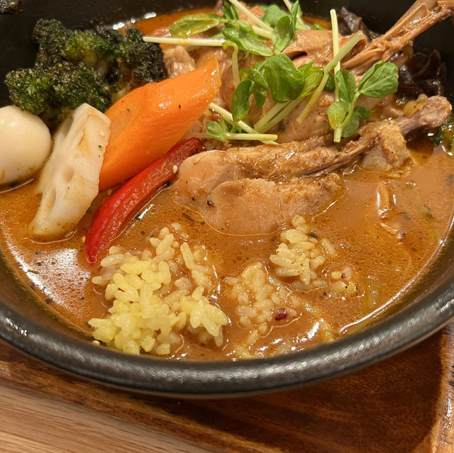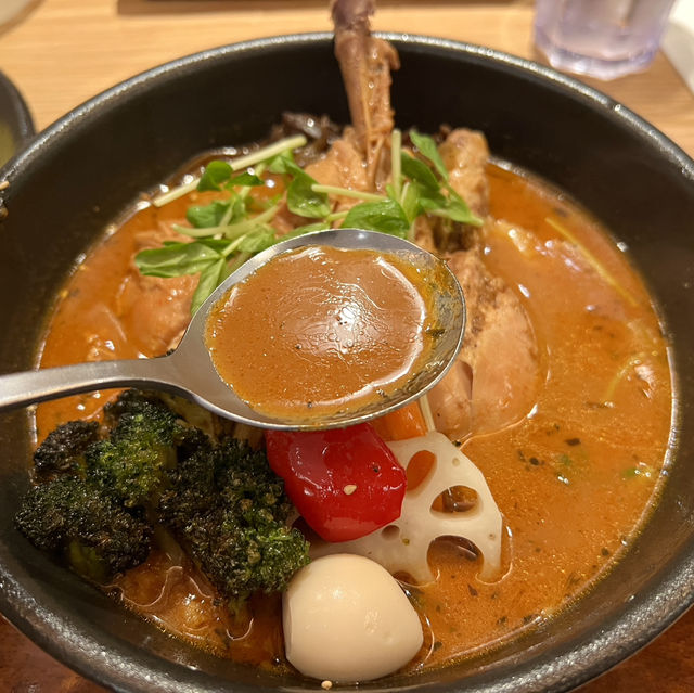 #Overseas travel - Sapporo Karaku When you come to Sapporo, you must eat soup curry, and this is a review of the most famous one, Karaku! There are two Karakus, one near Susukino and one near Sapporo Station. I went to the one near Sapporo Station, which is less crowded. It opens at 11:00, so I arrived around 10:30 and was able to get in right away without waiting! It was more delicious than I thought, and it was more interesting because you don't mix rice in the soft soup, but roll it up! The fried toppings are also delicious, and you can adjust the spiciness, so I recommend it!