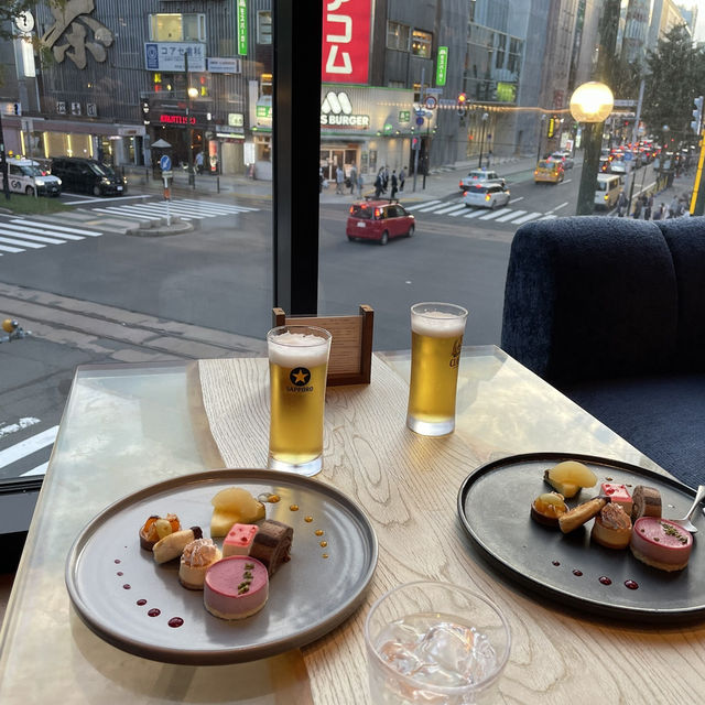 Stay at KNOT Sapporo You can enjoy beer and sweets in the lounge. The location is also great, with a panoramic view of the station street. I recommend choosing a city view room. And here are Sapporo's three great gourmet dishes: Soup curry: Treasure... This soup curry is flavored with bonito dashi and is absolutely delicious. Ramen: Shingen... If you want to try it, be prepared to wait at least an hour. But it's worth the wait. Sushi: Saikaku... For lunch, you can get the nigiri sushi shown in the fourth photo for around 1,200 yen. Other dishes include Genghis Khan and a shime parfait, so one night's stay would be far from enough.