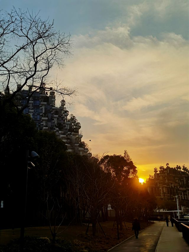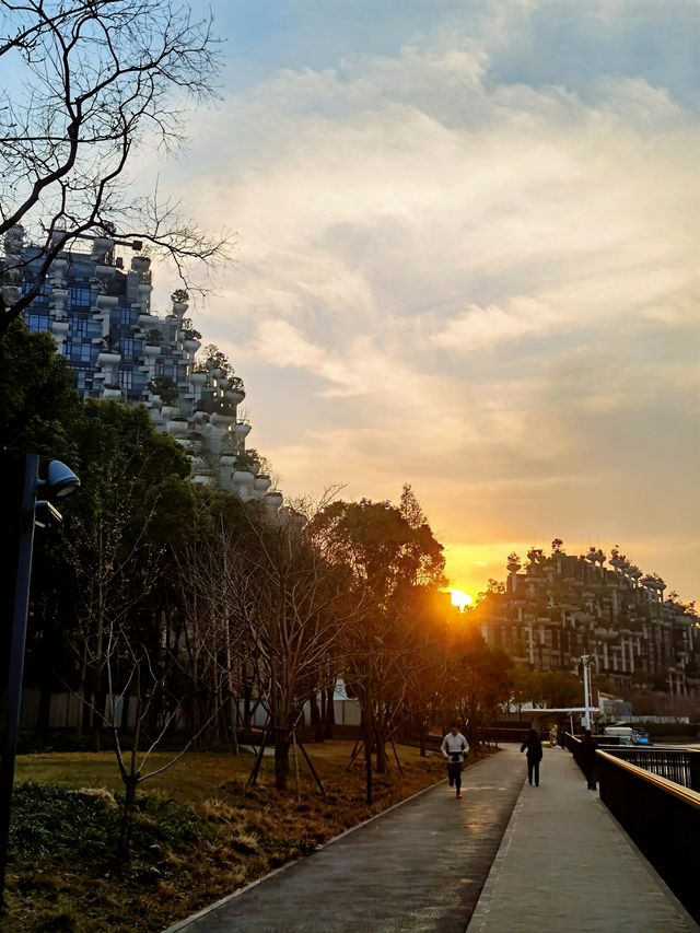 🌄The weather was good this weekend☀️. Many residents were walking their dogs🐩 and children, running🏃, and water birds🐦 were resting on the banks. Cruise ships🚤 were moored. From time to time, wild pigeons🕊 flew across the sky⛅️. There were also singers singing🎤 by the river… 🌄On Suzhou River, near Qianshu Tianan|Suzhou River Changhua Road Pier^, you can just see the sunset🌇, hanging in the middle of two buildings🏘, just like hanging on the mountainside☀️🌄. 🌄This internet-famous building on the Suzhou River, Tianan Qianshu, has been completed for three years and has received mixed reviews and discussions. Some internet celebrity bloggers even called it one of the "Top Ten Ugliest Buildings" in the country, and their explanations were very reasonable. 🌄In fact, the designer of this building is very famous. He is the British architect Thomas Heatherwick, an art master known as the contemporary Leonardo da Vinci. Many people did not get the architect's original best intentions at all, and directly projected their inner "imagination (shadow)". Only by walking around and taking a look at it can you appreciate its uniqueness and different beauty🏞🌅. 🌄From the "Seed Temple" in the 2010 World Expo Park, to the Fosun Art Center in the Bund BFC, the newly completed cultural landmark Shanghai West Bund Orbit, and the Ocean Crystal Tianan Qianshu, which has been built for three years (the second phase of construction is nearing the end) and is popular on the entire Internet, they are all works of this British architect. On the fourth floor of Qianshu Tianan Shopping Mall, there is a special introduction to the buildings he designed. In his eyes, no building is outdated and should be abandoned, and how to make buildings more interesting and timeless is a question that every designer should think about. 🌄When he designed this building, his idea was to recreate a space in a modern city like Shanghai that is "infinitely large" and to restore the sense of symbiosis between man and nature. So he designed countless pillars, each topped by a tree🌳. People can rest between the layers of buildings☕️ and coexist with nature🌿🌺🍂. 🌄Thomas Heatherwick is an architect who insists on conquering the world with imagination. The slogan of this shopping mall on the Suzhou River is "Enjoy the different!" Tolerating differences and building harmony together. In the new year, I hope everyone will have more beautiful imaginations about everything🗺💕💕