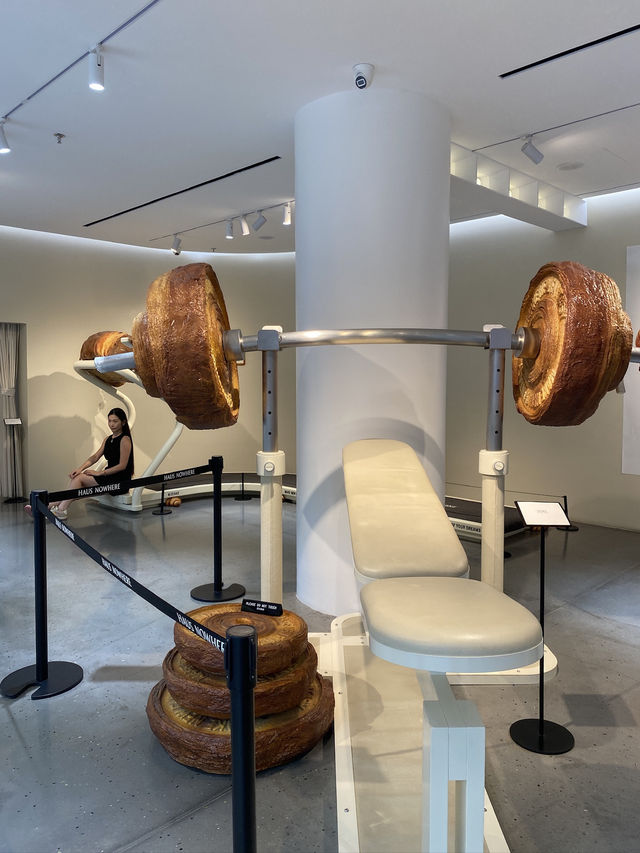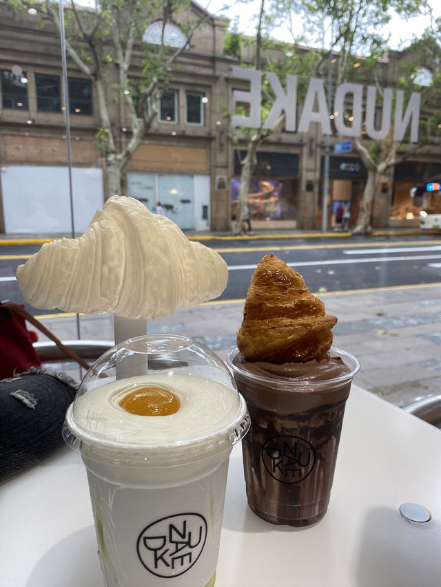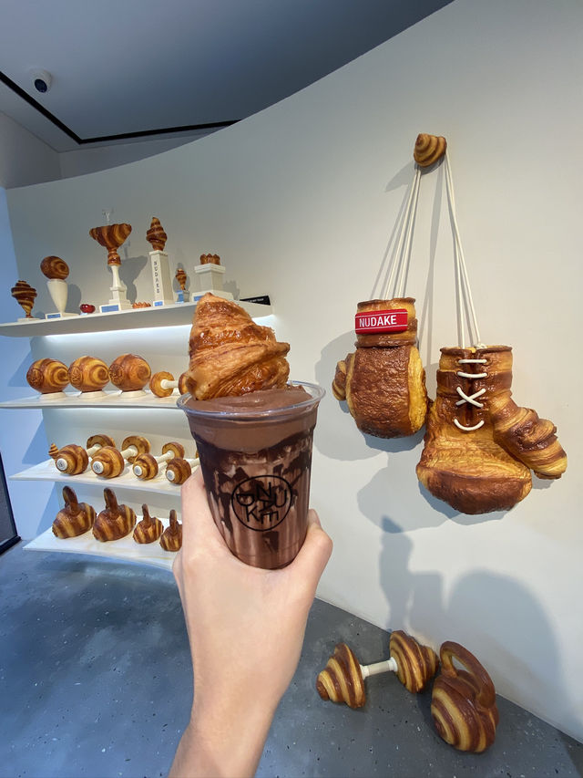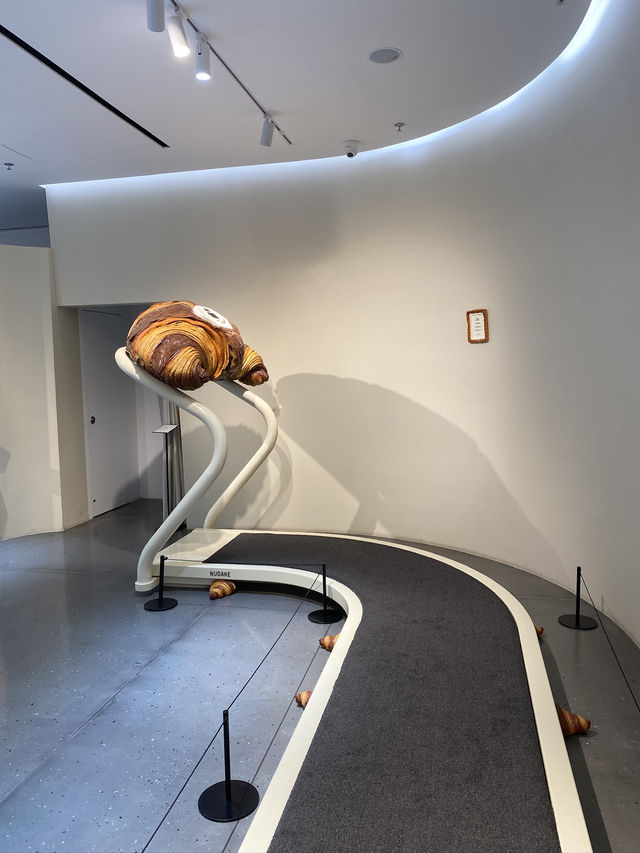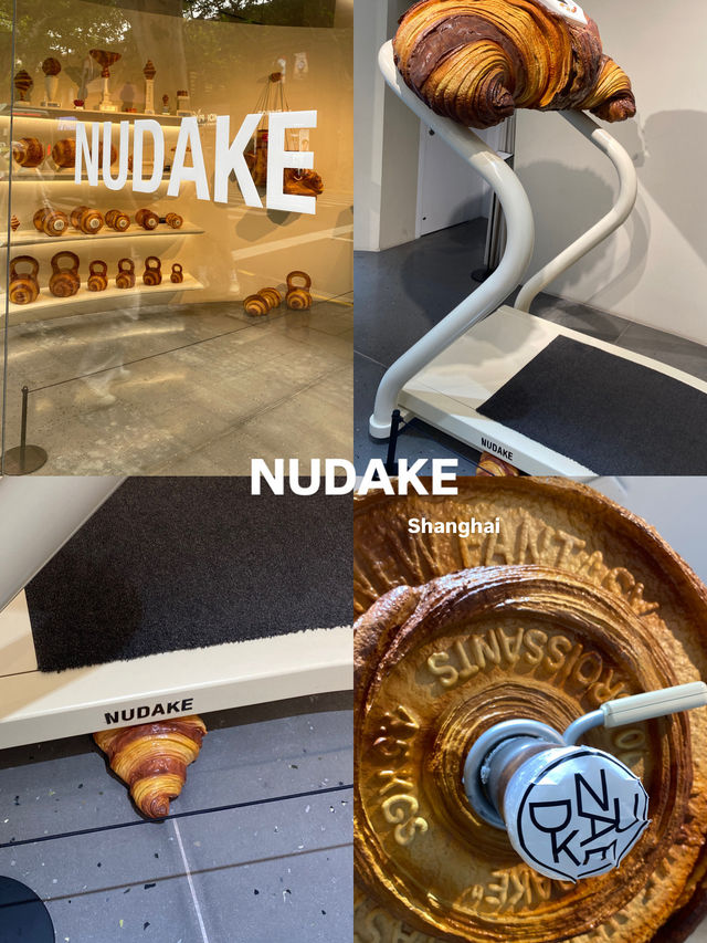 Nudake is an experimental cafe/bakery under the Gentle Monster brand, known for its concept + retail experience / art installation. Theme: "Croissant Gym" — the space features croissants as part of the decor / installation, including dumbbells, treadmills, weightlifting equipment, and experimental art that plays with pastries and architecture, combining function + appearance. We went in the morning, so there weren't many people. There were plenty of photo spots. The croissants were absolutely delicious! #ShanghaiTravel