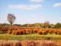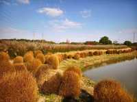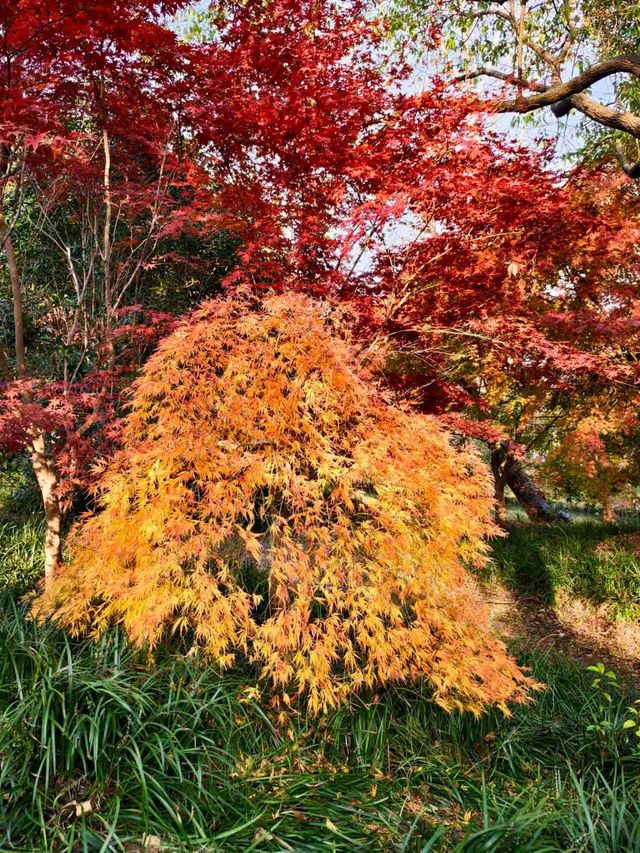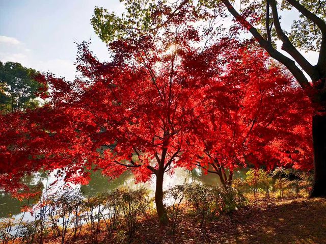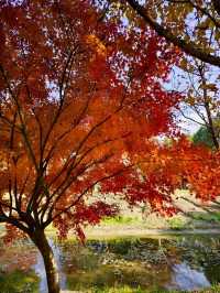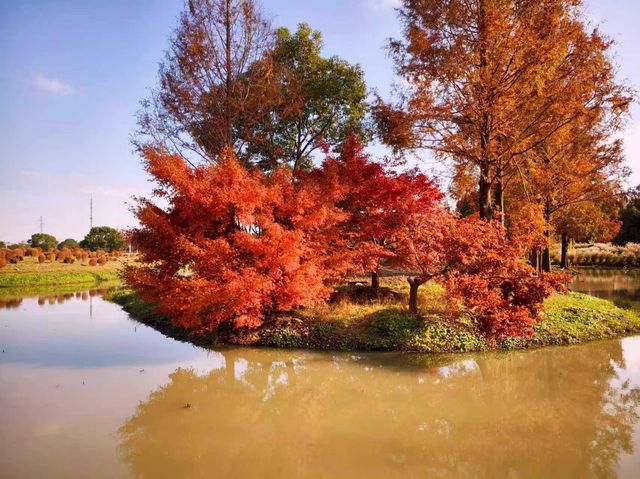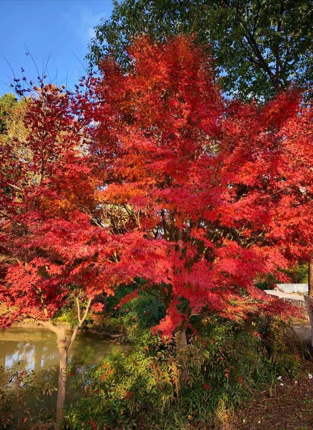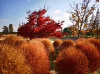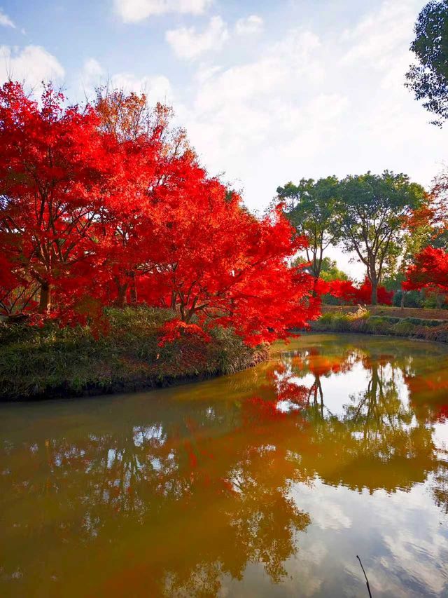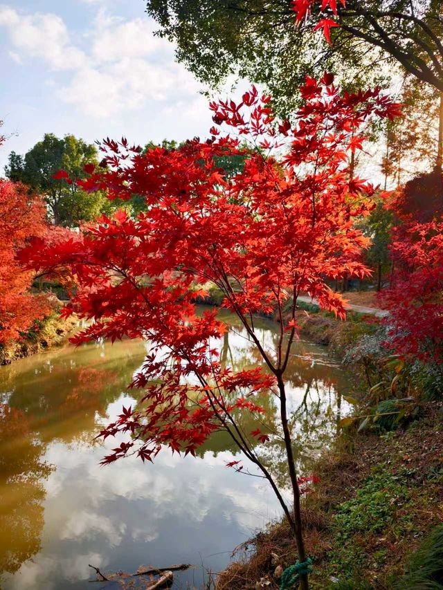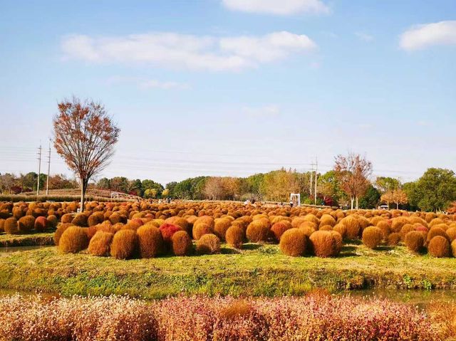 After autumn began, I saw many videos online showing the Kochia at Huakai Sea Ecological Park looking super beautiful, so I finally decided to visit in person on a free weekend. Huakai Sea Ecological Park is in Jinshan, a lesser-known suburban park, about an hour’s drive away. There is a fairly large parking lot outside the park. After parking, you walk along a pebble path lined with villagers’ stalls on both sides to reach the main entrance. The main road is decorated with lanterns and oil-paper umbrellas, giving a festive atmosphere. On the right is the rental point for four-wheeled bicycles. The park is large, so renting one is necessary if you want to explore thoroughly, but many paths inside are inaccessible to four-wheeled bikes, which has its pros and cons. Next to the rental point is a small river, and the maple trees 🍁🍁🍁 by the riverbank are bright red and very beautiful. Since we came for the Kochia, we headed straight to the flower fields deep inside. Large fuzzy balls grew in the fields, but their colors were no longer as striking as in the videos. The most beautiful time for Kochia should be when green, red, and purple are interwoven, creating a colorful spectacle from afar. Now most Kochia are brownish, with only a few still faintly showing purple. We came too late and missed its peak beauty, which is such a pity. With the mindset of making the most of the visit, we headed to the Autumn Scenery Garden. Passing a sunflower 🌻🌻🌻 field, what caught our eyes was a sea of red. It turned out the maple trees 🍁🍁🍁 lining the path were at their peak, so red that it was impossible to look away—so stunning and delightful! 💖 The entire Autumn Scenery Garden is filled with red maples in various shades: classic maple red, brick red, dark red, sunset red, vermilion, scarlet... layered and intertwined. The afternoon sunlight at two or three o’clock filters through the maple leaves, making each leaf glow like jade, and the light casts beautiful shadows on the ground. The maple trees by the lake reflect on the water, dyeing the surface a rosy red. Such a beautiful scene is intoxicating and makes the trip worthwhile. Huakai Sea Ecological Park also has a plum garden 🌸, which should be great for plum blossom viewing in winter.