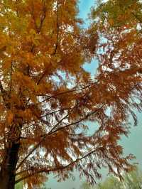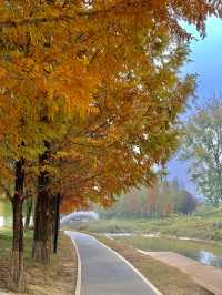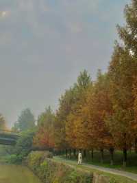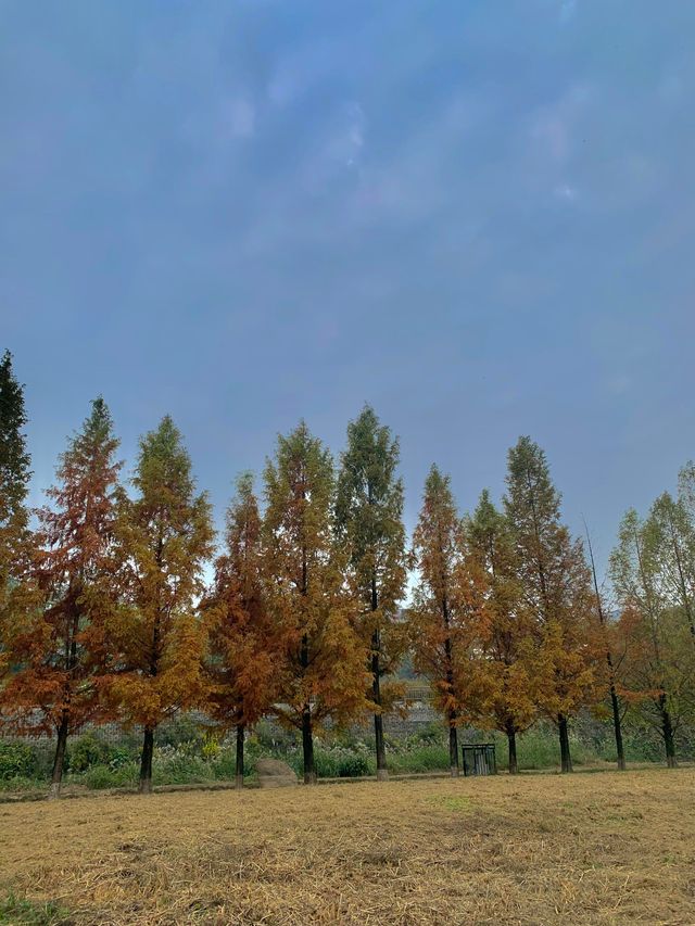 |The metasequoia trees here are unique. The metasequoia forest is most beautiful in autumn and winter, when the leaves turn reddish brown, creating a unique landscape. Generally, from mid-November, the color of the metasequoia trees will gradually become bright, which is the best time to enjoy the scenery.   📷Recommended photo spots: 1⃣Small bridge on the Juhe River: There are two small bridges on the Juhe River near Gule Square. Standing on the bridge, you can take a high-angle photo of the extension of the metasequoia forest and the winding walkway, which increases the depth of the picture. 2⃣Both sides of the riverbank: Take photos of the metasequoia forest on the other side of the river, which can show the scale and spectacular scenery of the whole metasequoia forest. At the same time, you can use plants such as reeds by the river as the foreground to take more layered photos. 3⃣Under the metasequoia trees: Under the metasequoia trees, take photos from a low angle to highlight the height and straightness of the metasequoia trees. You can also hold some props, such as coffee cups, magazines, etc., to add atmosphere to the photos. 4⃣River and metasequoia trees in the same frame: Choose to take photos on the stone bridge over the river, and you can include the S-shaped curve and metasequoia trees in the picture, making the photos more beautiful and artistic. When the sun sets, take photos of the river and metasequoia trees on the north bank of the Juhe River, and the reflection on the water will be very beautiful.   🧥Dressing suggestions: In terms of clothing color, it is recommended to choose warm colors or solid colors, such as khaki, off-white, caramel, etc., which echo the color of the metasequoia forest and can better highlight the autumn and winter atmosphere. Avoid wearing clothes that are too fancy or too bright in color to avoid conflict with the background. In terms of style, you can try sweaters, woolen coats, scarves, berets, etc., to create an atmosphere like a late autumn Korean drama movie. ➡How to get there: 🚇Subway: Take Metro Line 2 and get off at Hejiaying Station. After exiting from Exit A, walk north for about 800 meters to Gule Square. 🚘Self-driving: If you drive there, you can navigate to Hejiaying Gule Square.