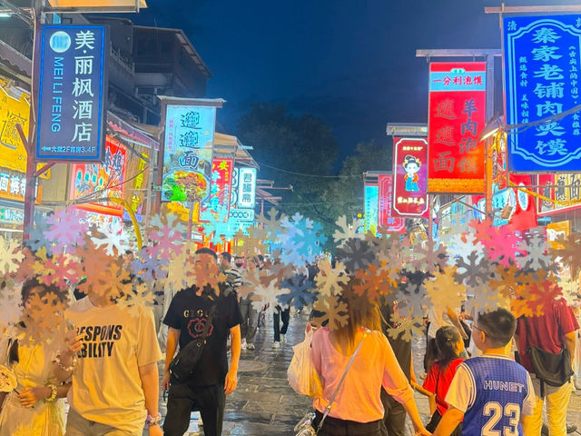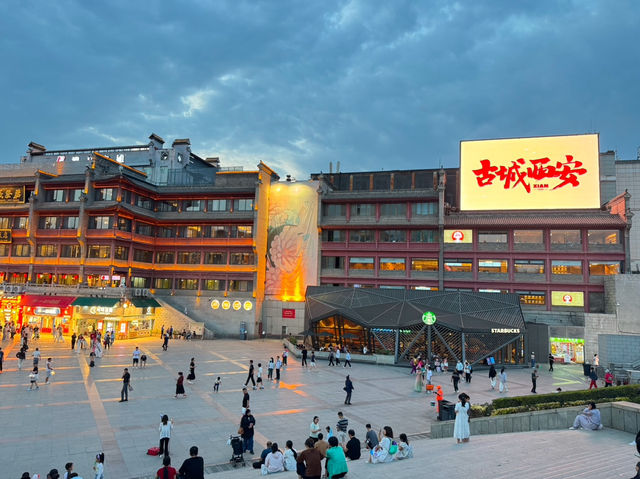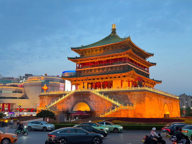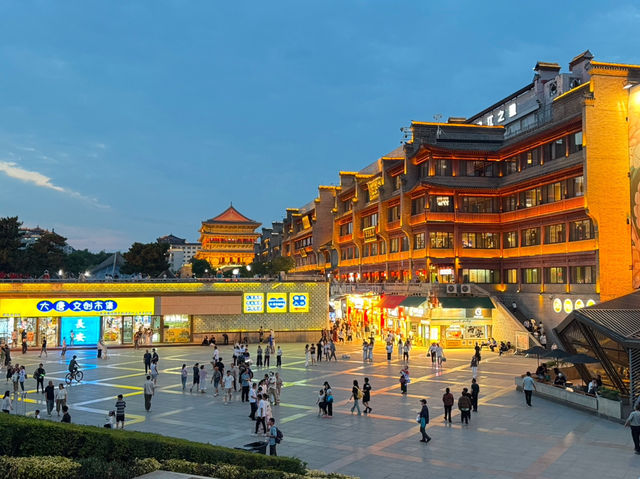 It was past 6 PM on a holiday, and the sky was still bright, but there were already crowds waiting for the moment the bell tower lights up. The bell tower at night truly takes on a different look. Tickets are required to enter. The Drum Tower is also nearby, about a 10-minute walk away. In front of the Drum Tower is a bustling shopping street with a wide variety of Xi'an delicacies.