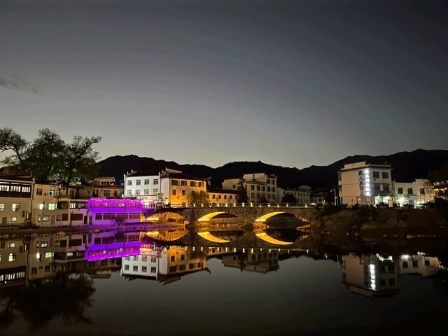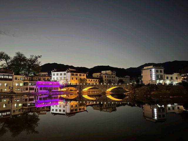 Hengchun at night exudes a serene and enchanting atmosphere, illuminated by the soft glow of traditional black-and-white Hui-style houses in Anhui Province. The warm yellow light of lanterns reflects on the stream flowing through the village, accompanied by the gentle sounds of crickets and a light breeze. Some homes still emit faint smoke from kitchen stoves, while villagers close their doors to rest after a day's work. The starlight above the mountains behind the village adds a romantic and mysterious touch. Hengchun at night is a picture of simplicity and tranquility, evoking a profound sense of warmth and relaxation.