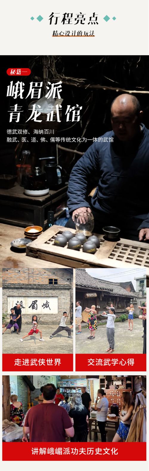 [Martial Arts Culture Experience] Step into the Emei Sect Qinglong Martial Arts Hall for an authentic, non-assembly-line experience. Guided by renowned masters, explore the historical roots and inheritance secrets of Emei martial arts.