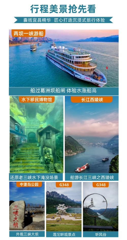 1. Experience the rising water level as the ship passes through the Gezhou Dam Ship Lock, visit the popular underwater museum attraction, and check in along the G348 Three Gorges Tourist Highway.