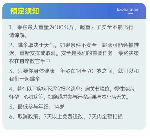 4. The following conditions are not suitable for skydiving: shoulder dislocation, chronic diseases, pregnancy, heart disease, etc. If you conceal these conditions and participate, our shop will not be responsible for any consequences. 5. Minimum participation age: 14 years old.