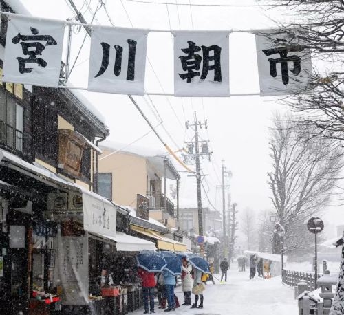 ▲ Miyagawa Morning Market One of Japan's three major morning markets. The market is held along the Miyagawa River and in front of the Takayama Jinya. With approximately 60 stalls, it offers a variety of goods including fresh vegetables, fruits, sauces, snacks, and handicrafts.