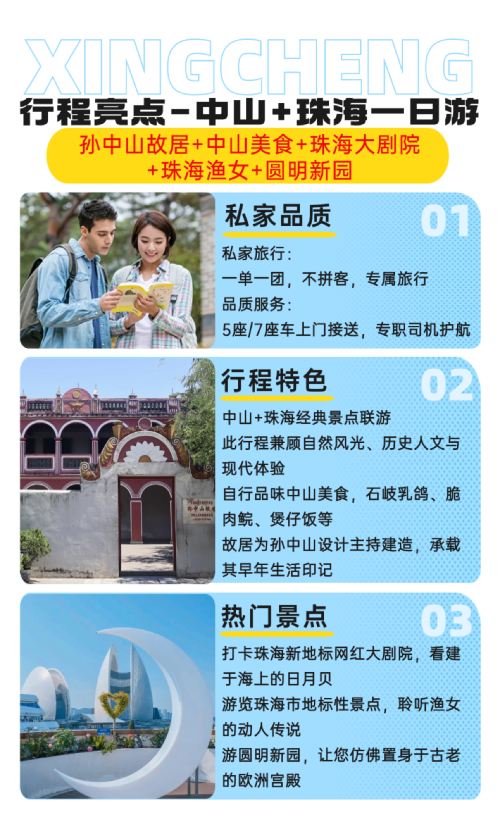 Zhongshan + Zhuhai Classic Attractions Combo Tour; This itinerary combines natural scenery, historical culture, and modern experiences; Savor Zhongshan delicacies on your own, such as Shiqi pigeon and crispy meat carp