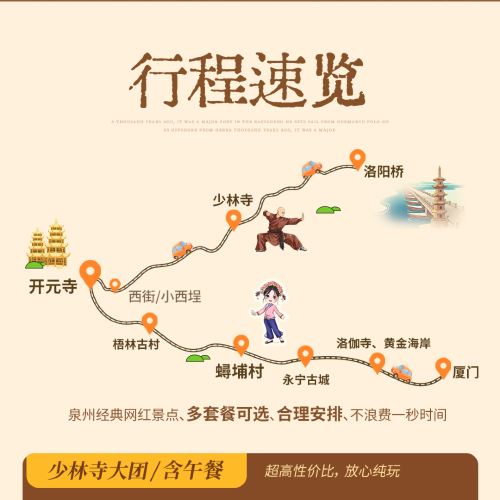 Explore multiple classic attractions and experience the vibrant life of the ancient city. [Southern Shaolin Martial Arts · Luoyang Bridge Maritime Silk Road] Immerse yourself in the Zen martial arts culture of Southern Shaolin and discover the thousand-year-old stone bridge heritage of Luoyang Bridge.