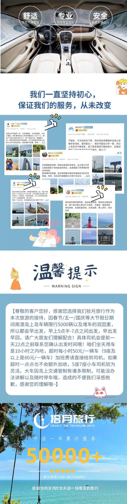 ⑥Dear friends, thank you for choosing us. Our itinerary has no hidden costs, and we welcome product comparisons. We never engage in fake orders or reviews—every single feedback is genuine. Routes/titles can be copied, and even our newly introduced attractions get copied, but service and quality cannot be replicated. From the very beginning, our company has been dedicated to creating premium routes in Nan'ao Island, serving over 50K+ travelers since we opened!