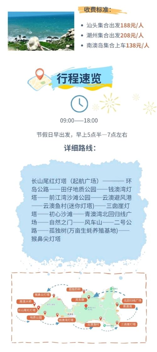 Route for large vehicles (12 seats and above): View Nan'ao Bridge from the vehicle, Changshanwei Red Lighthouse. Starting from Qihang Square - Scenic drive along the most beautiful island ring road - View Lighthouse of Qian'ao Bay from the vehicle - Qianjiang Bay Beach Park - Yun'ao Fishing Port - Yun'ao Fishing Village (mini lighthouse) - Sancong Cliff Lighthouse - Chuxin Beach - Qing'aowan Astronomy Square at Qingao Bay - Nature's Gate - The Lonely Tree (10,000-mu oyster farming base)