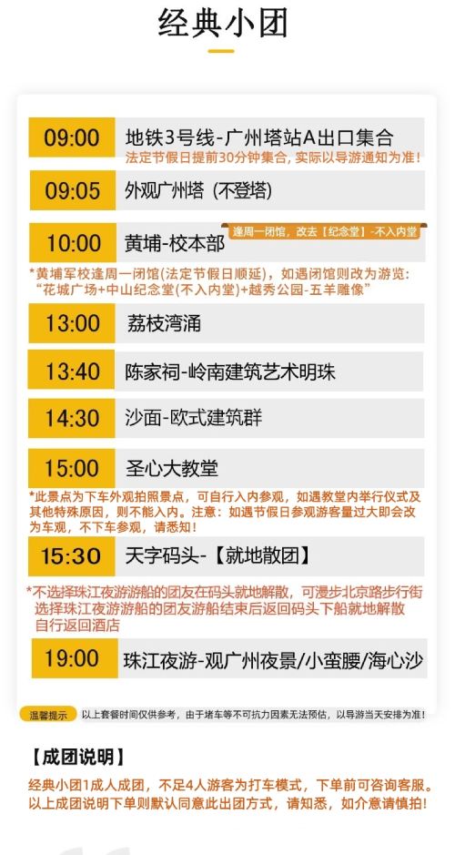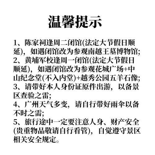 The Whampoa Military Academy is closed every Monday (postponed on statutory holidays), and the itinerary will be changed to visit Huacheng Square + Sun Yat-sen Memorial Hall (excluding the inner hall) + Yuexiu Park - Five-Ram Statue. No further notice will be given. Please be informed!