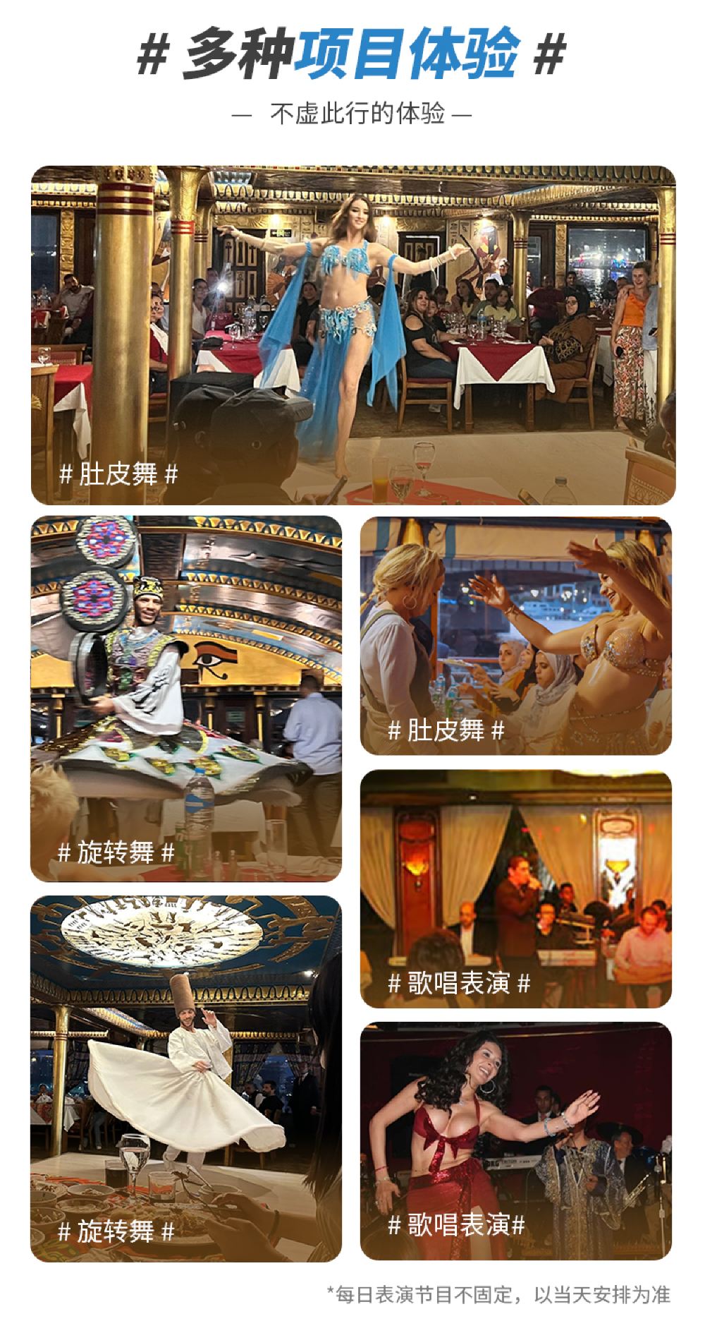 Exciting performances: Belly dance, whirling dervish, and singing shows featuring classic traditional dances, a real eye-opener