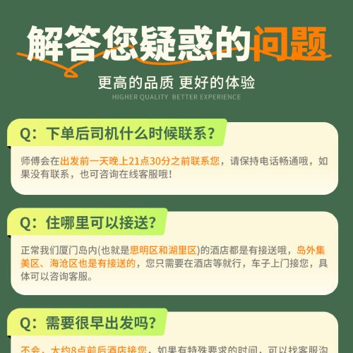 1. The itinerary time and sequence on this tour page are approximate references and subject to actual departure conditions. Staff will contact you by 10 PM the night before (please refer to the actual notification and keep your phone or SMS accessible to avoid delays). Pick-up points in Xiamen's Siming District/Huli District/near hotels with convenient parking. For Gulangyu, please return to the ferry terminal on your own. In areas where vehicles cannot stop, follow staff instructions to wait at the meeting point. Round-trip pick-up & drop-off points in Haicang: Haicang Tianhong/Haicang Shitang Bus Station, Taidi Haixi Bus Station. Round-trip pick-up & drop-off points in Zhangzhou: Zhangzhou North Expressway Exit Logistics City East Bus Station.