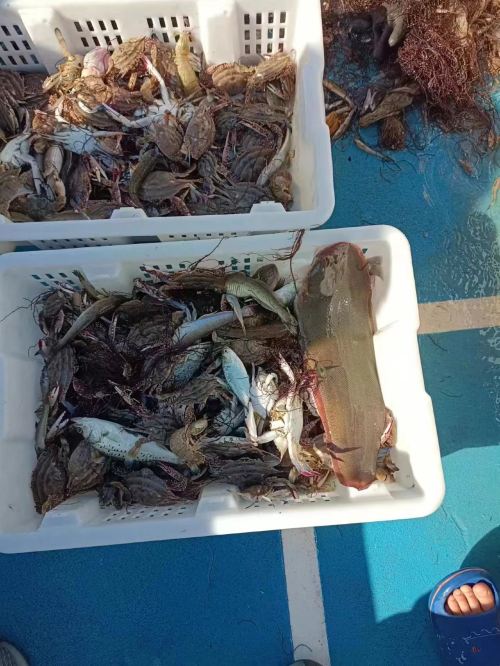 Every haul of the net is filled with anticipation, bringing in a rich variety of marine life such as red-legged crabs, flower crabs, sea snails, and various fish species, making for a bountiful catch.