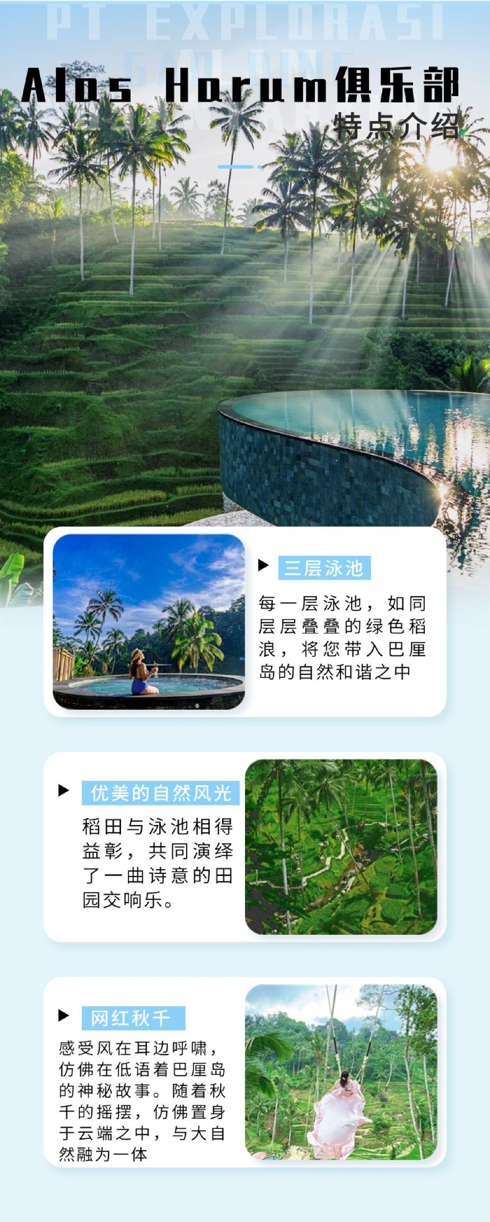 Alas Harum Club is nestled in the heart of Bali's Ubud rice terraces, a popular Instagram-worthy destination that combines natural beauty with leisure experiences. Surrounded by the lush Tegallalang terraces, it features an infinity pool, hammock terrace, jungle swing, and flying fox, offering an immersive tropical rainforest experience. Visitors can relax by the poolside, take photos, or challenge themselves with the thrilling Bali Swing while overlooking the stunning tiered rice fields. The park houses several scenic restaurants serving exquisite cuisine. Alas Harum perfectly blends nature, entertainment, and aesthetics, making it an unmissable "one-day escape" experience in Ubud.