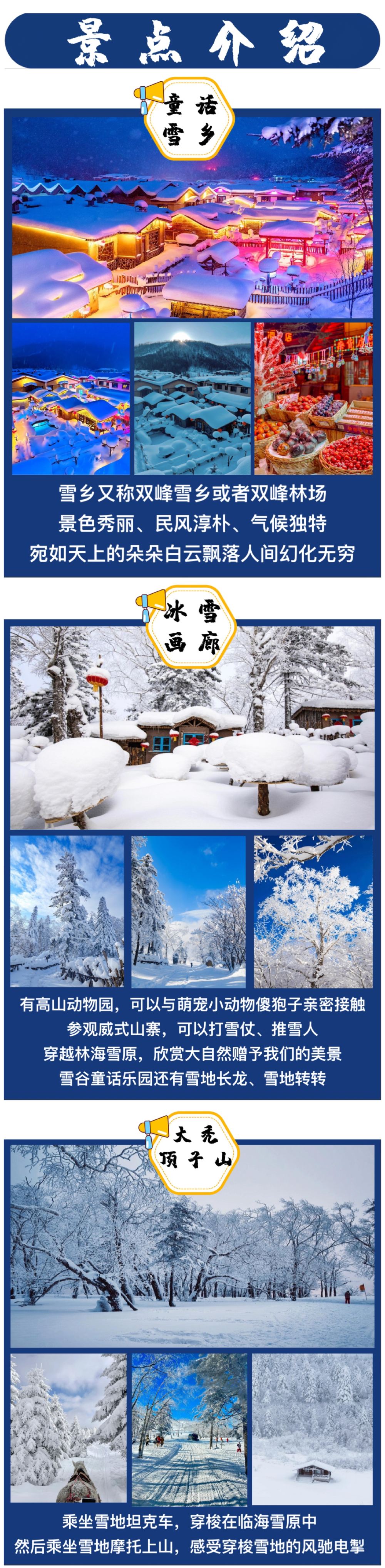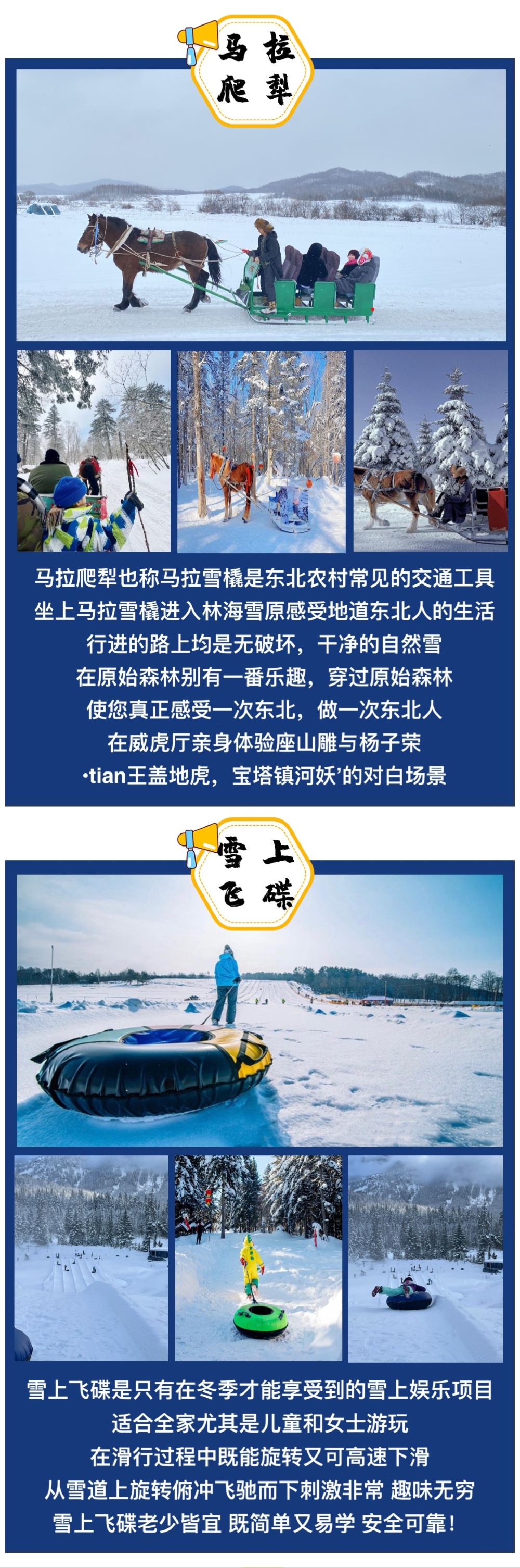 • Package C: [Includes complimentary Snow Saucer, Snow Treasure Hunt, Weihu Mountain Village, and Yangko Dance] Horse-drawn sled, Yaxue Highway, Da Tuding Mountain, snowmobile and Snow Dragon Track ride through snow-covered forests, Snow Village, Snow Village Stone Monument, Xueyun Street, and Bangchui Mountain Viewing Platform