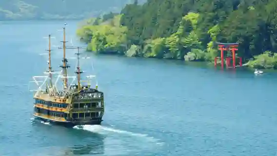 Cross Hakone Shrine's lakeside torii gate: Feel history whisper as Mount Fuji mirrors in Ashinoko's tranquil waters.