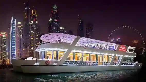 Witness the spectacular view of Dubai Marina at night cruising on board of a modern glass houseboat