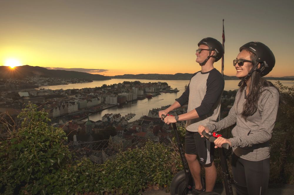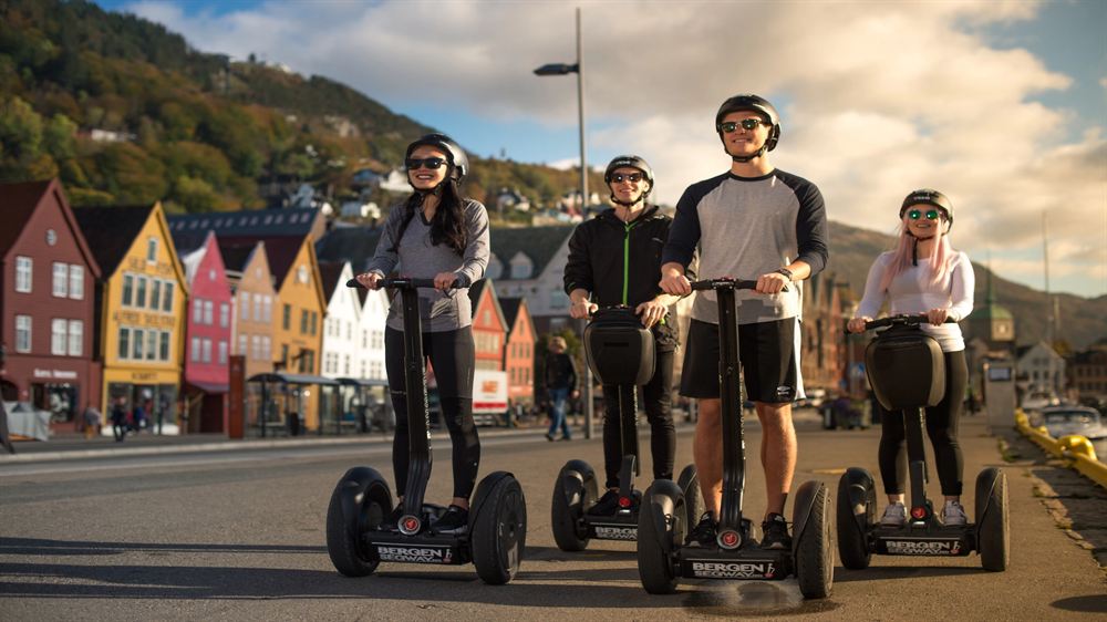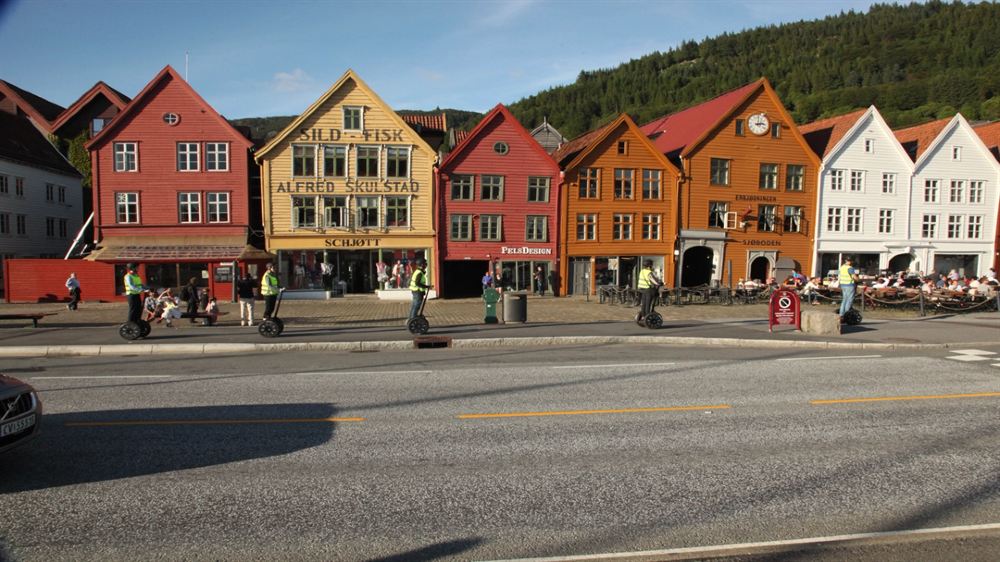 The journey begins at Cruise Terminal 2 in Bontelabo, just a short walk from the city center. Here, there's a spacious area perfect for practicing on Segways, where everyone can learn the basics before starting the tour. Then, the adventure continues through Bergen Fortress and its beautiful parks. Next, you'll head to the historic Bryggen (a UNESCO World Heritage Site) before making your way to the fish market. Afterward, the tour will take you to Akvariet i Bergen - The National Aquarium, followed by a visit to Nordnes Park. This is one of Bergen's most beautiful parks, leading you to the westernmost point of the city center. The route then proceeds to a monastery in Nordnes before passing through Galgebakken and Knøsesmauet, exploring several of Bergen's classic alleyways and some of its most stunning streets. From Nordnes, the guide will lead you to Den Nationale Scene (the National Theater), the Blue Stone, St. John's Church, and Lille Lungegårdsvannet. You'll then continue through Kalfarveien in downtown Bergen before reaching Fjellveien. At Fjellveien, you'll enjoy breathtaking views of Bergen's city center and surrounding areas—guaranteed to offer excellent photo opportunities! From Fjellveien, you'll drive back to Bergenhus Park in the city center.