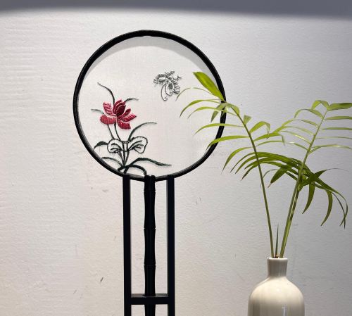 Technical features: Double-sided embroidery, employing techniques such as rolling stitch, connecting stitch, blending stitch, and spreading stitch, using 8-count silk threads