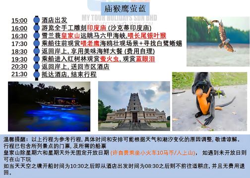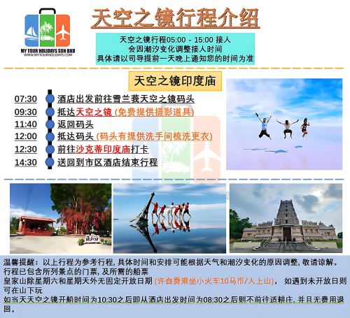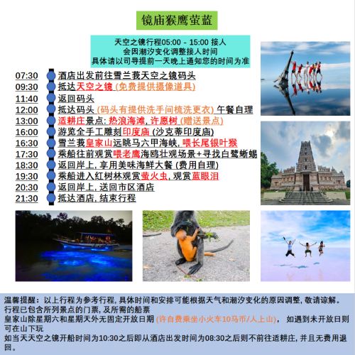 Package A-B-C-D-E-F-G-H Mirror Temple Monkey Eagle Firefly Blue / Sky Mirror + Indian Temple (includes Sky Mirror itinerary) Hotel departure time (5:00 AM–3:00 PM) may be adjusted based on tidal changes.