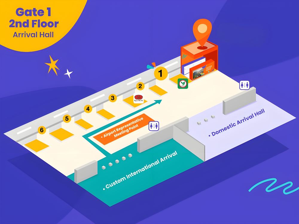 - Second floor, Arrivals Hall, Gate 1, next to the KBank counter