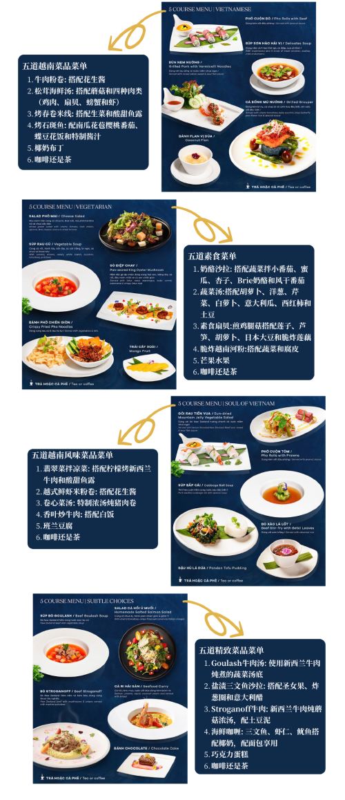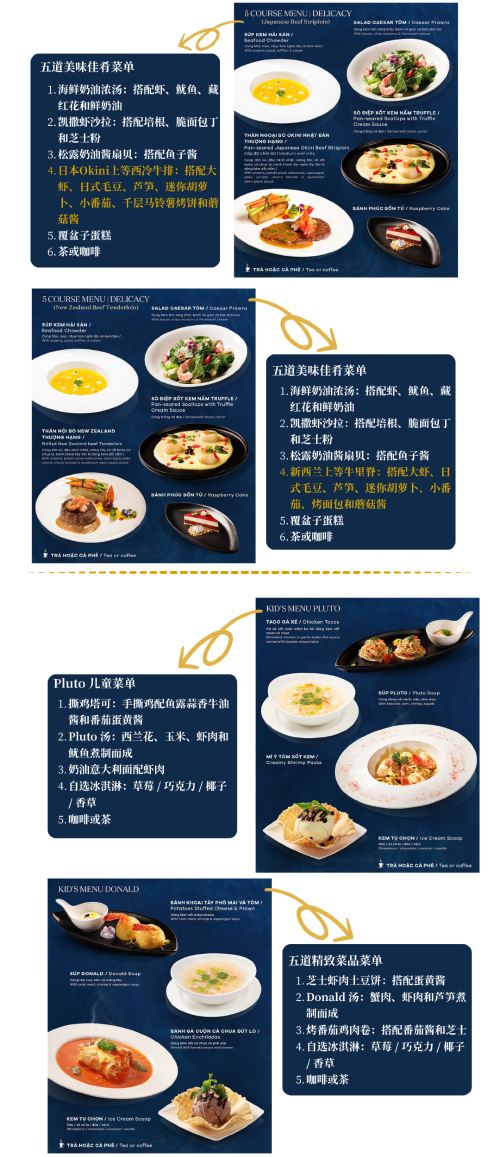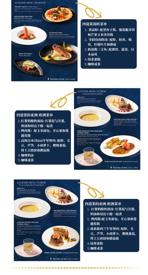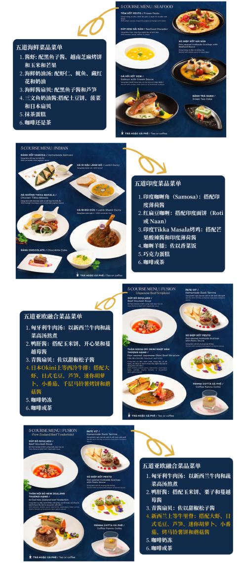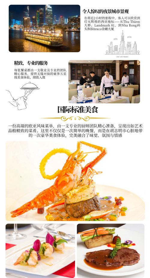 The ship offers a variety of meals (including Vietnamese, Western, seafood Option, etc.), accompanied by live music or performances, suitable for couple' dates, business receptions or celebrating important moments.