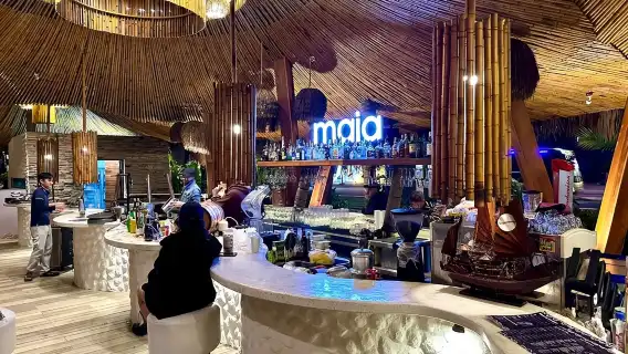 Unwind at a stylish beach bar, sipping your complimentary drink as you feel the sea breeze, enjoy chill music, and watch the city lights