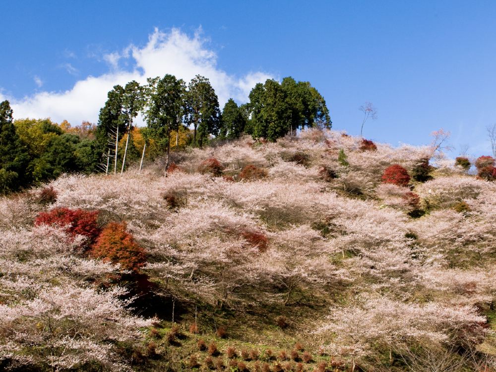 Obara Shikizakura is a hybrid variety of wild cherry blossoms, combining the "Bean Cherry" and "Edo Higan" species. Unlike the typical Somei Yoshino cherry blossoms, it blooms in spring but reaches full splendor in fall. Every November, over 10,000 Shikizakura trees burst into bloom amid crimson maple leaves, creating a dreamlike seasonal spectacle where pink cherry blossoms intertwine with autumn foliage—a rare "cherry and maple duet" in Japan. Perfect for leisurely strolls and photo opportunities, it offers a uniquely romantic fall memory.