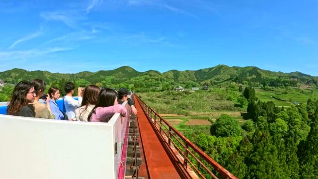 The open-air carriage slowly departs from Takachiho Station, following the former Takachiho Railway, taking you on a journey between the mountains and sea of clouds.