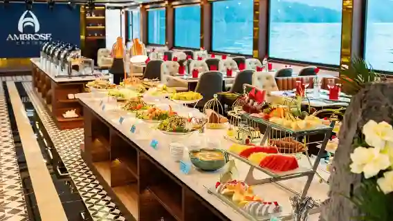 Enjoy a sunset party with tea, cakes, and fresh fruits on the boat