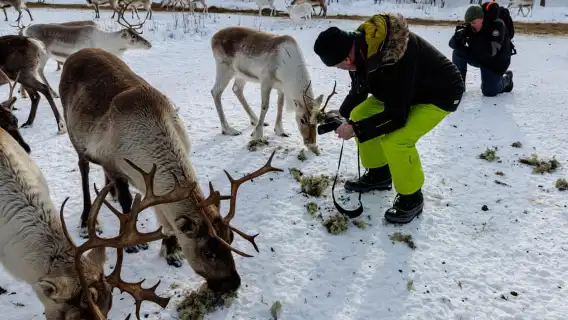 Enjoy a snowmobile sled ride through the reindeer pasture and feed the animals