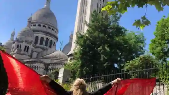 Dressed in colorful wings, follow the voice of the singer from Montmartre