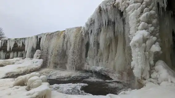 Admire the gleaming ice wall and sparkling icicles of the Jägala Waterfall