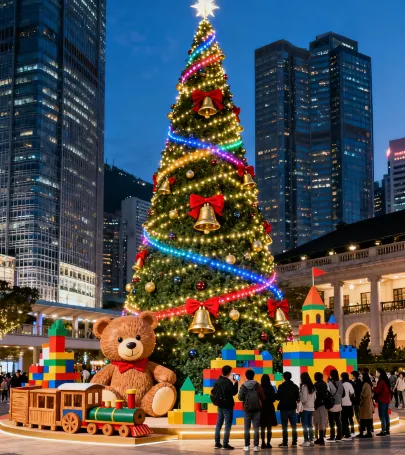 Visit the 20-meter-tall giant Christmas tree at Statue Square, surrounded by toy-themed decorations, perfect for Christmas photos. After November 28, you can also explore 12 Christmas wooden cabin markets to pick unique souvenirs. Then stroll along the Starlight Corridor on Chater Road, where railings are adorned with sparkling lights, perfect for romantic photos.